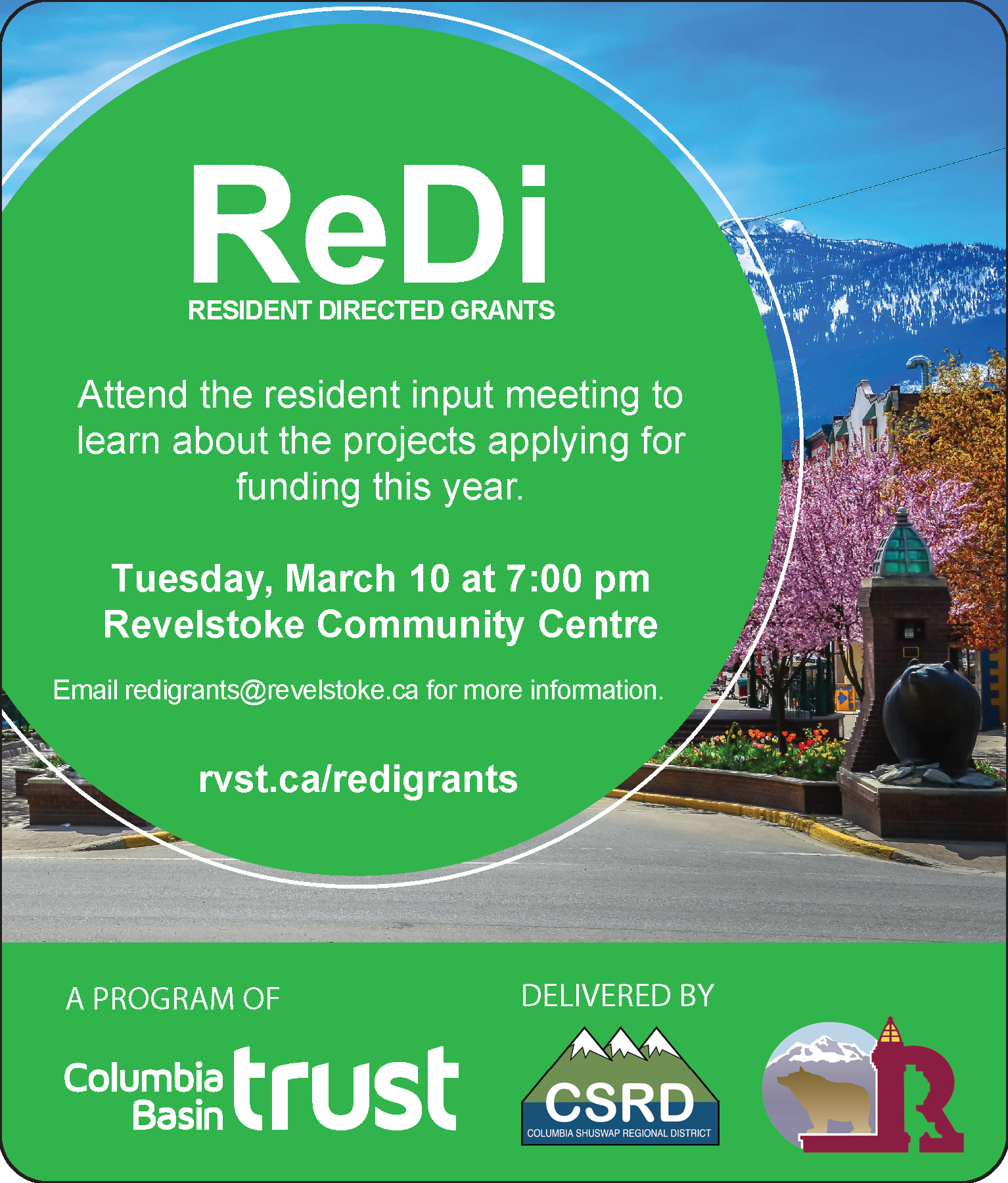 It’s time for the annual Resident Directed (ReDi) Grant community voting event! This is your chance to learn about upcoming Revelstoke community projects and vote on what matters to you (to ensure fairness, only those in attendance may vote).